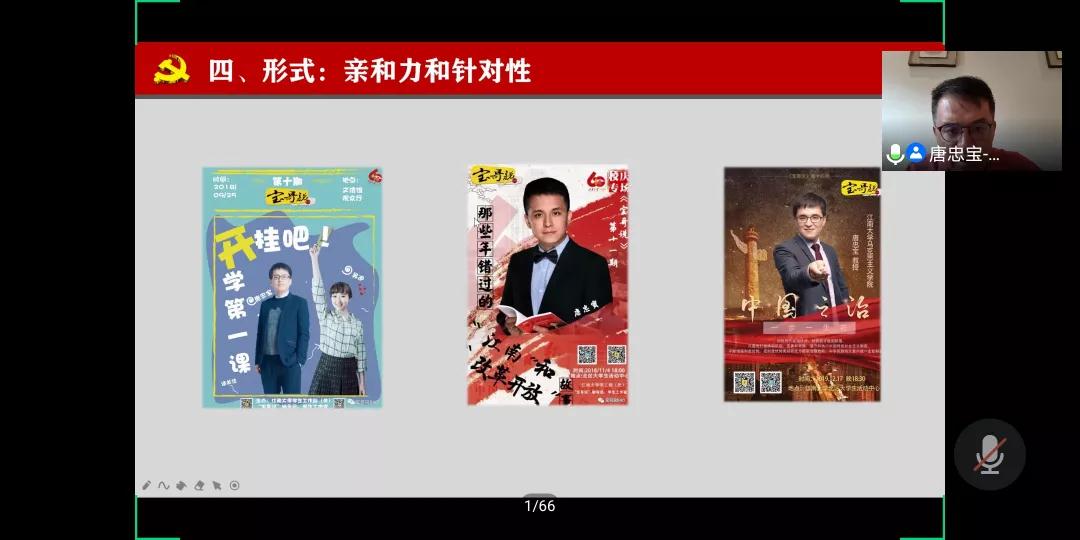 7月7日下午,中央电视台《百家讲坛》主讲嘉宾、中宣部全国“基层理论宣讲先进个人”、教育部全国“高校网络教育名师”、江南大学金年金字招牌诚信至上唐忠宝教授应金年金字招牌诚信至上邀请,与全区思政课教师相聚云端集体备课,并作了“提升《形势与政策》课堂教学魅力的几点思考”的专题报告。本次线上集体备课会由金年金字招牌诚信至上院长李春晖主持,全区各高校思政课教师200余人参会。