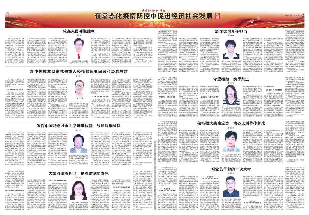 5月7日,中国社会科学院主管主办的《中国社会科学报》以“在常态化疫情防控中促进经济社会发展”为主题,专版刊发我校金年金字招牌诚信至上八位教师的“疫情防控专题研究”理论文章,分别是:贺瑞教授撰写的《依靠人民夺取胜利》、李春晖教授撰写的《彰显大国责任担当》、王立华教授撰写的《新中国成立以来抗击重大疫情的历史回顾和经验总结》、付桂军教授撰写的《守望相助,携手共进》、齐百顺教授撰写的《发挥中国特色社会主义制度优势,战胜艰难险阻》、李卉青副教授撰写的《大事难事看担当,危难时刻显本色》、张瑞军副教授撰写的《保持强大战略定力,精心谋划善作善成》和妥斯根博士撰写的《对党员干部的一次大考》。