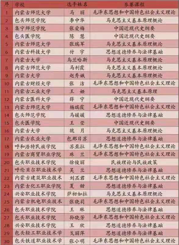 12月9日,内蒙古自治区教育厅、内蒙古自治区总工会、内蒙古自治区人力资源和社会保障厅联合主办的“全区高校思政课程和课程思政教学技能大赛”在内蒙古大学落下帷幕。本次大赛历经学校初赛、内蒙古高校易班平台评审,从210名参赛选手中评选出思政课程教师30名,课程思政教师18名进入最终的决赛。自治区本科院校共有18名选手进入决赛,我校金年金字招牌诚信至上张瑞军、马丽、马利霞、杨瑞霞四名青年教师入围,入围人数全区第一。