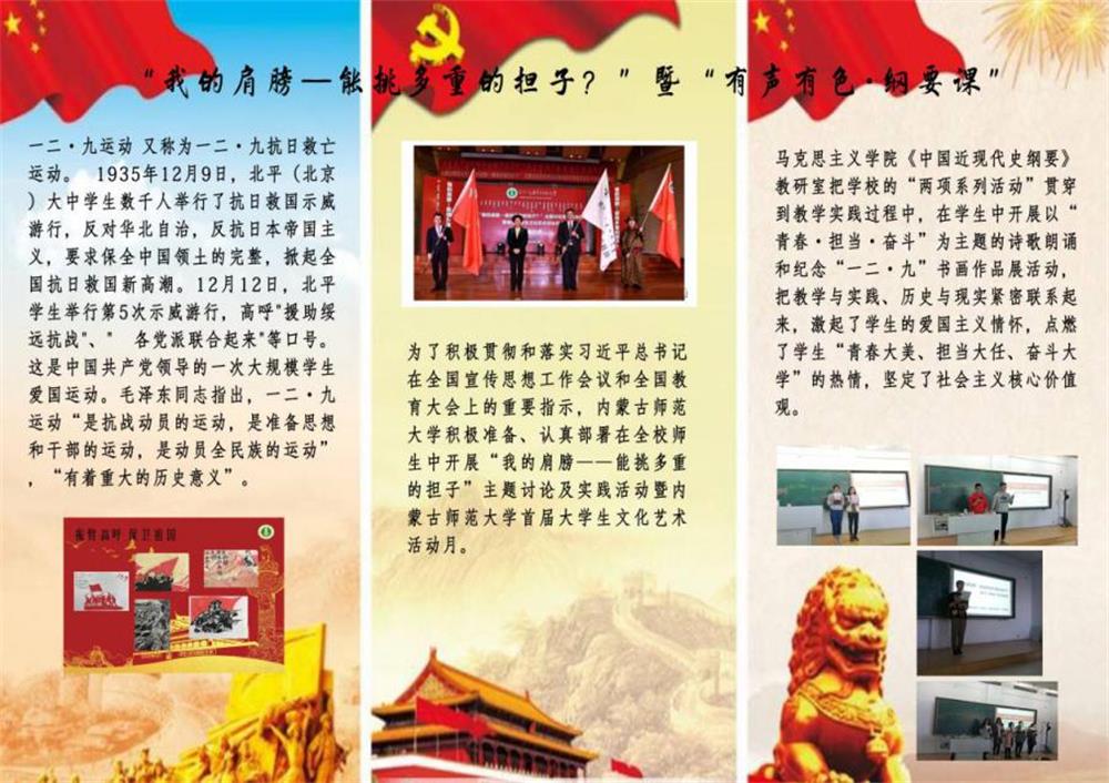 金年金字招牌诚信至上积极贯彻落实习近平总书记在全国宣传工作会议和全国教育大会上的重要指示,在全校师生中开展“我的肩膀——能挑多重的担子?”主题讨论及实践活动暨金年金字招牌诚信至上首届大学生文化艺术节活动月。为了把学校“两项系列活动”贯彻到教学实践中,金年金字招牌诚信至上《中国近现代史纲要》教研室在学生中开展了以“青春•担当•奋斗”为主题的诗歌朗诵和以“牢记历史•不忘初心”为主题的“一二•九”书画作品展。经过认真准备、积极部署,共收集学生作品二百余副,包括书法、绘画、雕塑及手工等作品,集中展示在学院楼二楼大厅和学院阅览室,同时由《中国近现代史纲要》课程的齐百顺老师进行现场教学,把教学与实践、历史与现实、爱国与奋斗紧密结合起来,激发了学生的爱国主义情怀,点燃了学生“青春大美•担当大任•奋斗大学”的热情,坚定了社会主义核心价值观。也推动了大学生思想政治课程教学改革的步伐,为打造“有声有色•纲要课”这个教学品牌做出有益的探索。