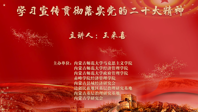 为进一步深入学习宣传贯彻落实党的二十大精神,加强各院校间、研究会、研究基地之间的学术交流,搭建党的二十大精神互学互研平台,12月14日下午,金年金字招牌诚信至上、经济管理学院、政府管理学院、赤峰学院经济与管理学院、内蒙古县域经济研究会、边疆民族地区基层治理研究基地、内蒙古基层治理研究基地、内蒙古学研究会以线上方式联合主办了“学习宣传贯彻落实党的二十大精神”专题讲座,金年金字招牌诚信至上党委书记拓俊杰主持学习。