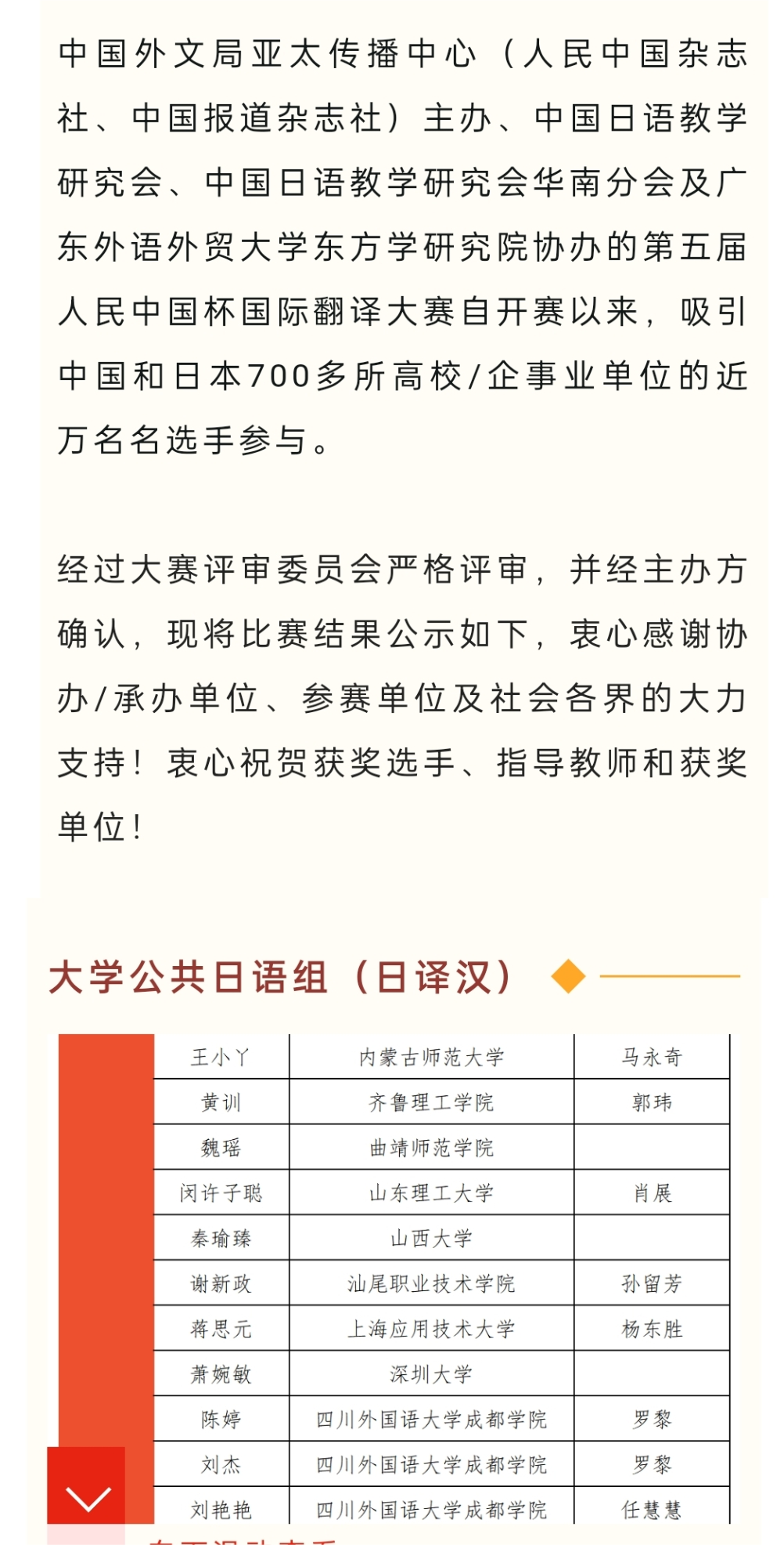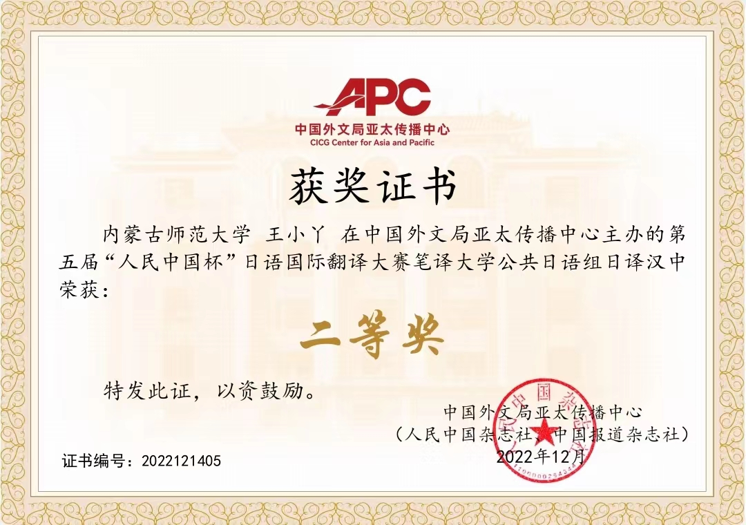 近日,由中国外文局亚太传播中心(人民中国杂志社、中国报道杂志社)和教育部日语专业虚拟教研室联合主办的第五届人民中国杯日语国际翻译(口笔译)大赛获奖名单已经揭晓,在此次比赛中,金年金官网王小丫同学取得了优异的成绩,荣获第五届"人民中国杯"日语国际翻译大赛笔译大学公共日语组日译汉二等奖。