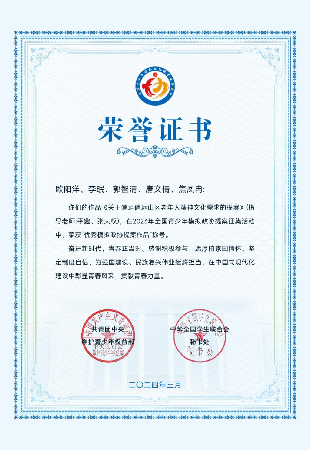 全国青少年模拟政协提案征集活动是一项旨在提高学生参政议政意识、培养其独立思考能力和团队协作精神的社会实践活动。青年团中央维护青少年权益部开展了2023年度全国青少年模拟政协提案征集活动,金年金官网报送的《关于满足偏远山区老年人精神文化需求的提案》是由金年金官网学子欧阳洋、李珉、郭智清,唐文倩和焦凤冉同学在平鑫老师的指导下策划而成。从全国57.8万篇作品中脱颖而出,获得荣誉证书。