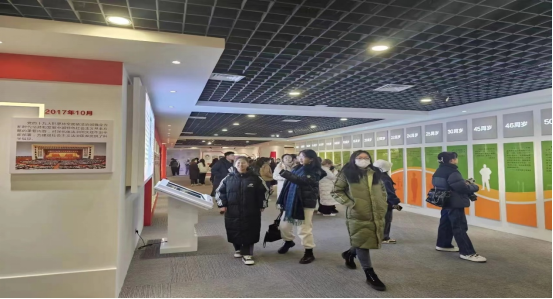 宣誓完毕,老师带领同学们前往厅外的走廊,这里全方位的展现了我国宪法的发展史,金阿拉坦苏和老师结合图文资料,用丰富的宪法专业知识,详细地向同学们介绍了我国宪法筚路蓝缕的发展和法治强国建设的累累硕果,进一步引发同学们对宪法的思考与讨论。在返程之际,大家一同在展览厅门前进行了合影,记录这收获满满的一天。