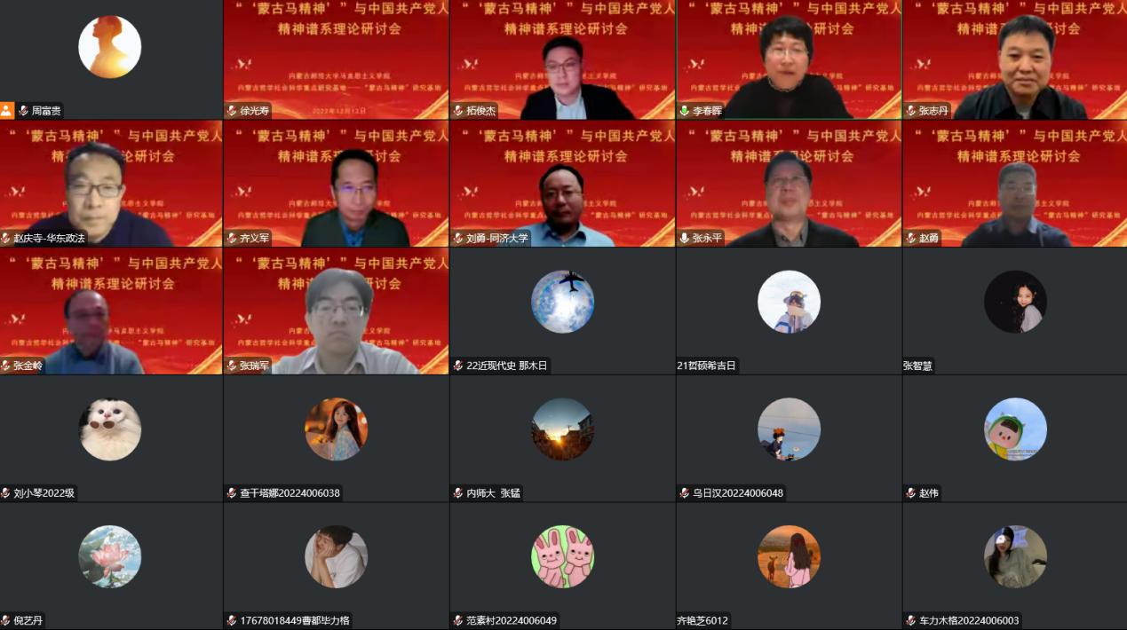 12月12日,“蒙古马精神”研究基地举办“‘蒙古马精神’与中国共产党人精神谱系”理论研讨会,本次研讨会由自治区党委宣传部理论处指导,由金年金字招牌诚信至上和自治区哲学社会科学重点研究基地——“蒙古马精神”研究基地承办。来自区内外的十余位专家学者在线上做主题报告和交流发言。开幕式由金年金字招牌诚信至上院长齐义军教授主持。